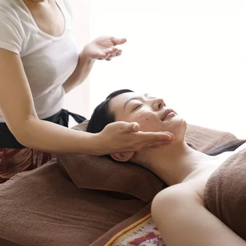 ヒーリングフェイシャル オールハンドで行うお顔のトリートメントです。お顔のツボを刺激し、優しいタッチでお顔を引き上げフェイスラインをすっきりさせます。 -